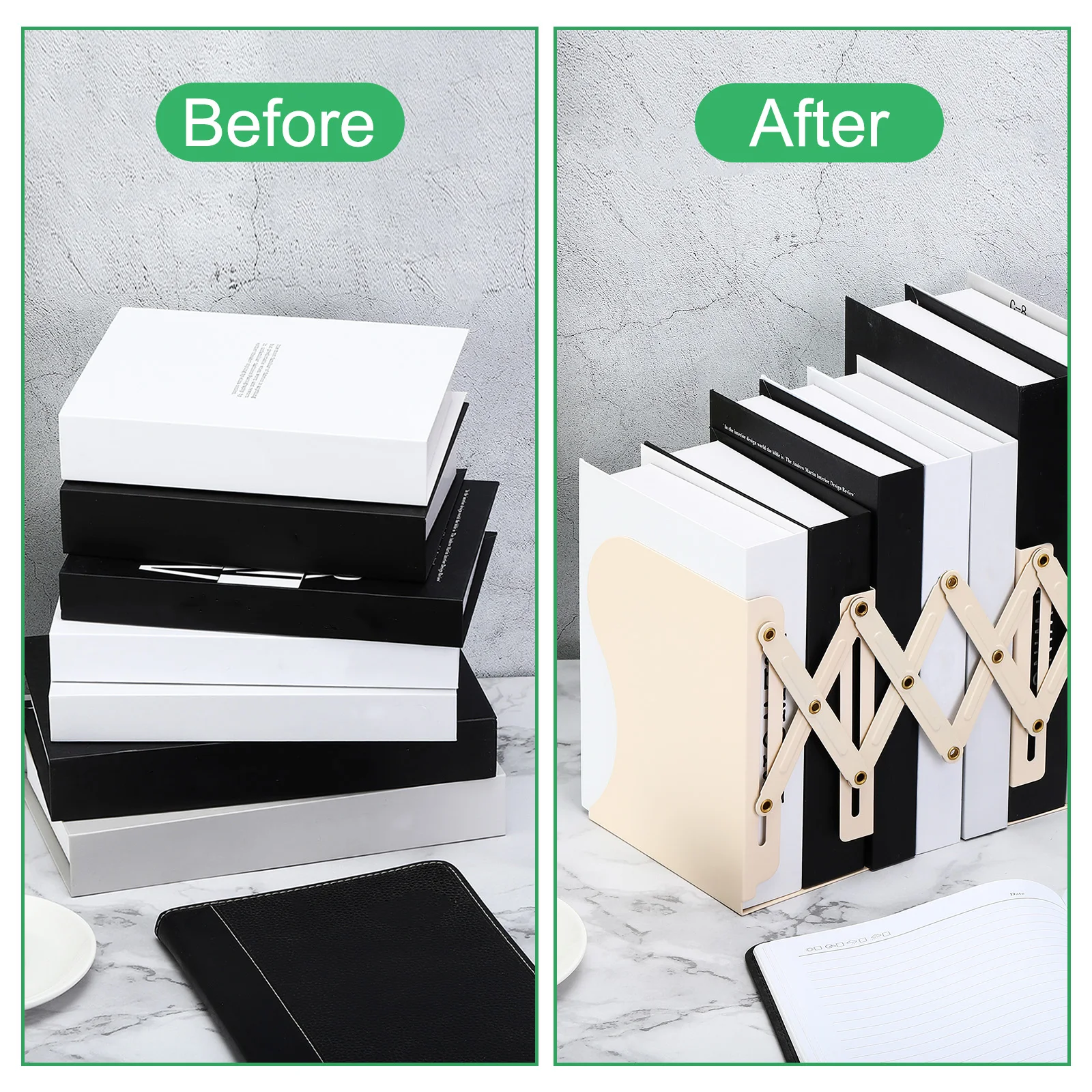 Expandable and Adjustable - This bookend is expandable and adjustable, the initial size is 3.9" x 5.9" x 7.5". The longest retractable size is 17.0'' x 5.9'' x 7.5''. It can be flexibly adjusted according to the volume of books. The bookshelf adapts to more space and can make your desktop of different sizes very neat and clean.