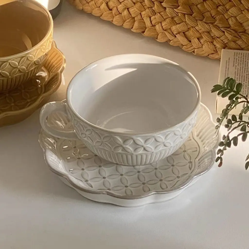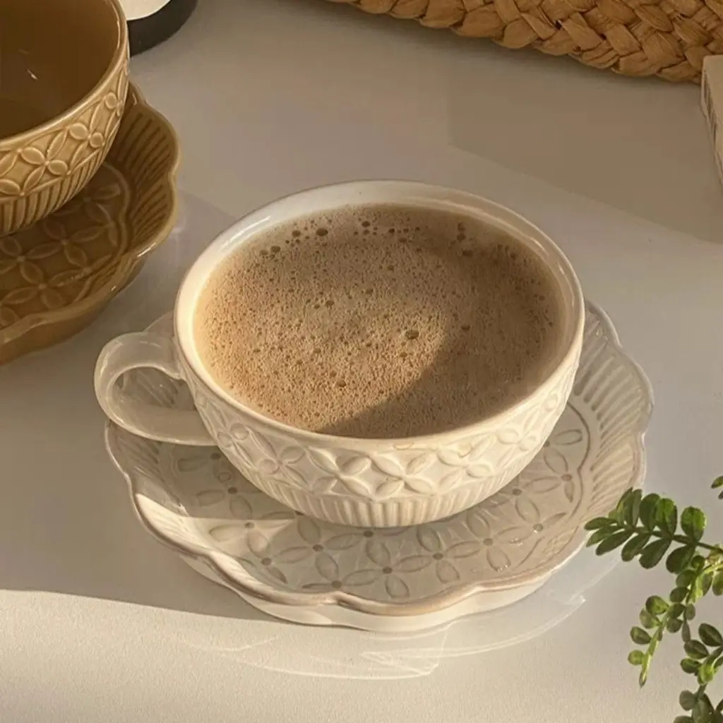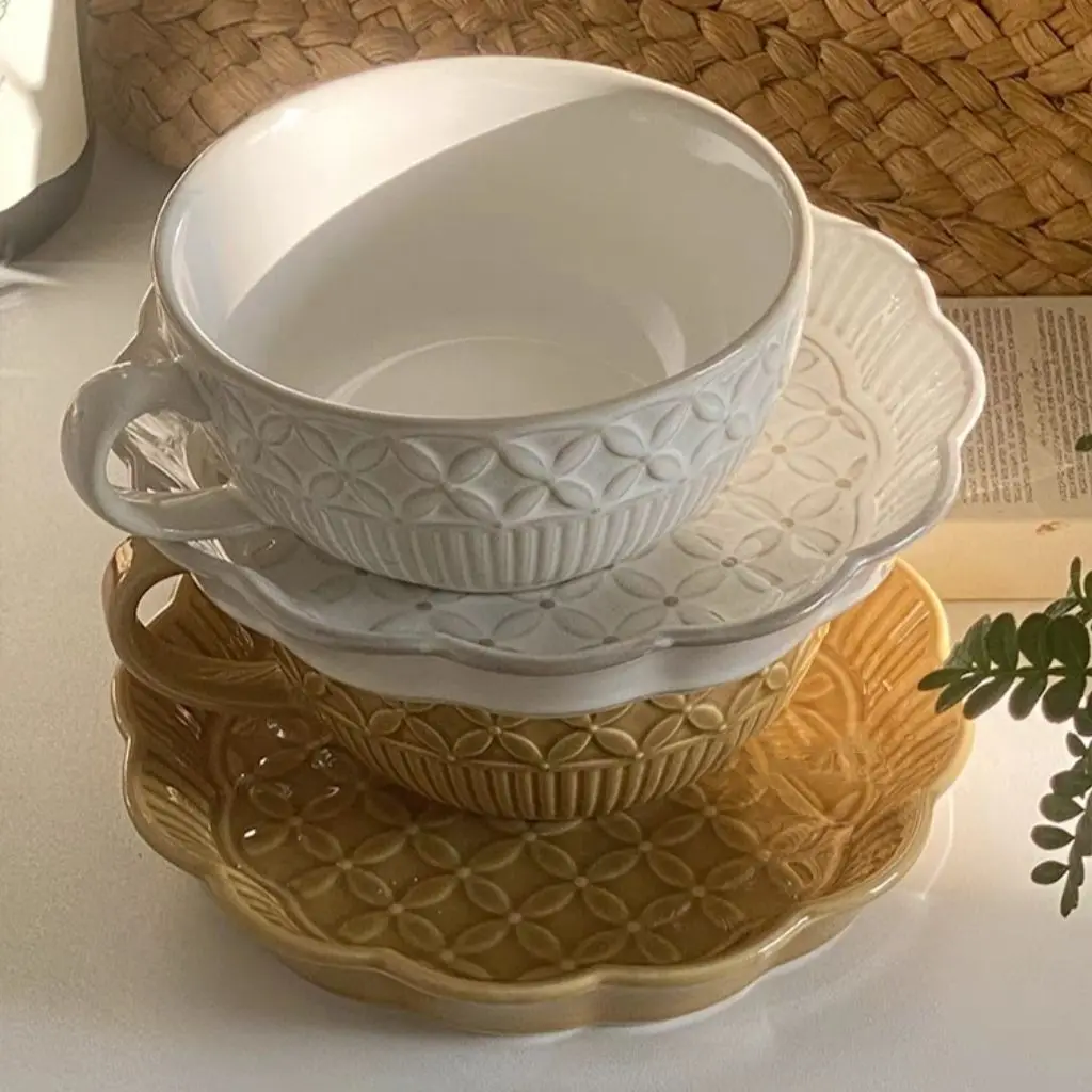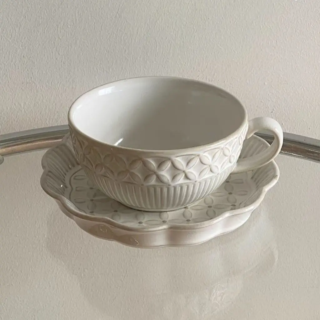 Embossed coffee cup and saucer, retro ceramic cup, dessert saucer, afternoon tea cup, latte cup, breakfast cup, dessert saucer