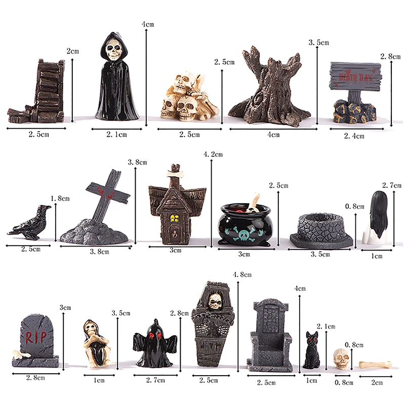 4. Halloween skull figurines decorations uses the classic elements of Halloween, such as gravestone, skull and so on; You can put them in your aquarium box, or put them on the table, tea table, bookshelf and so on, to decorate your all saints party and add more horrible festival atmosphere.