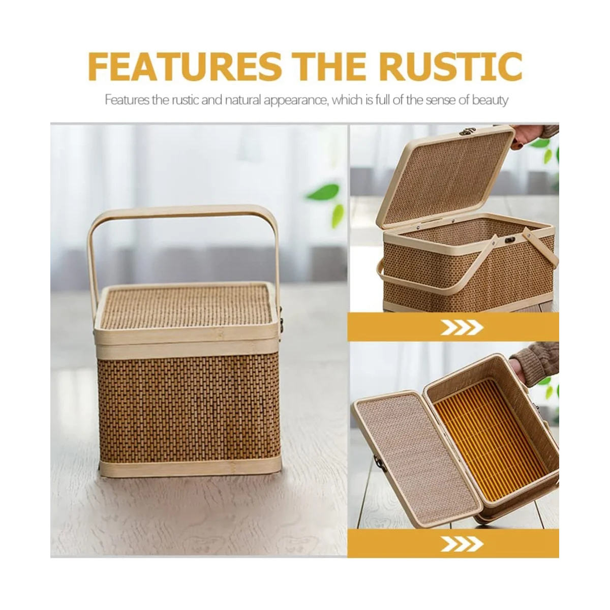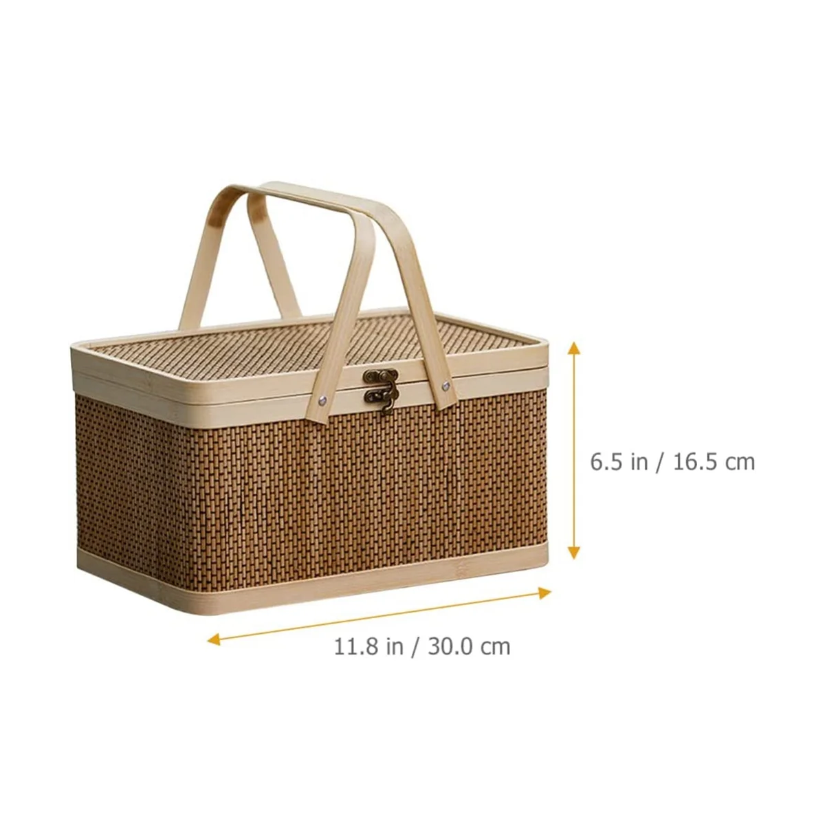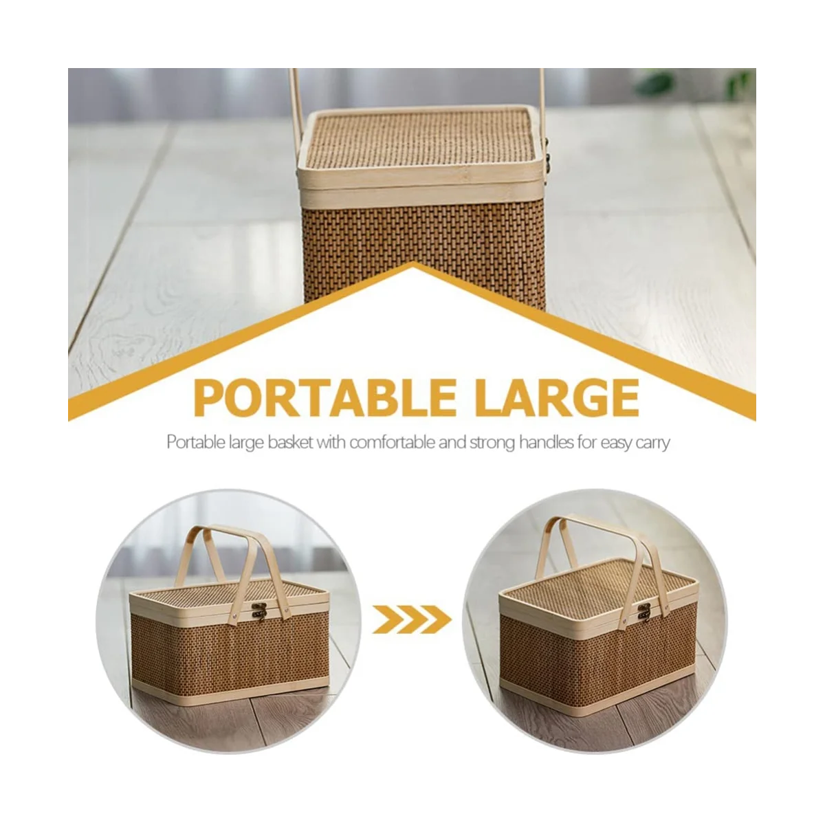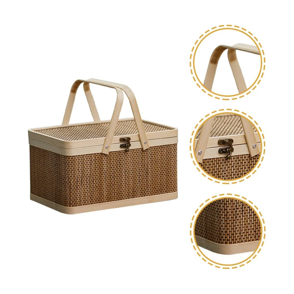 Bamboo Basket Natural -Friendly Woven Basket Bamboo Picnic Basket with Lid Handheld Snacks Bread Storage Basket
