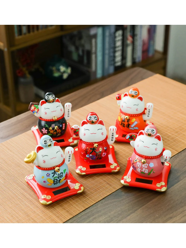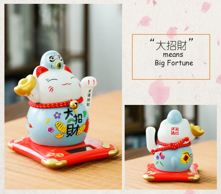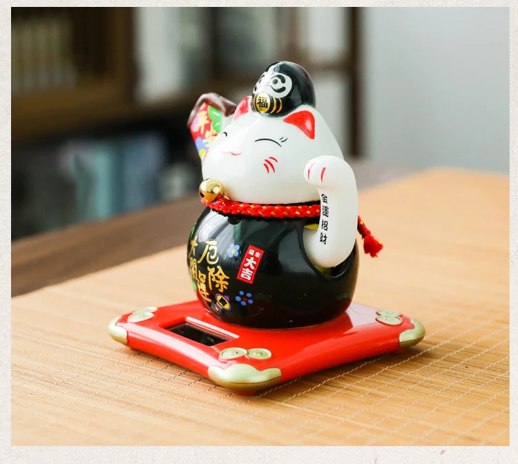 4.5inch Solar Powered Waving Arm Lucky Cat, Ceramic Fortune Cat, FengShui Figurine, Home Tabletop Deoration, Lucky Charm Gift