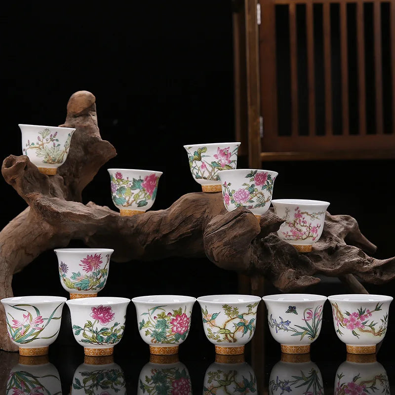 Kung Fu Tea Cup Twelve Flower Gods Set Enamel Pastel Ceramics 12 Pieces Gift Box Host’s Ceramics & Pottery Chinese Teaware