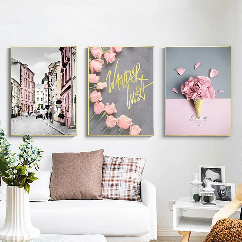 Minimalist Boho Pink Art Canvas Wall Decor Poster And Prints Tropical Green Plants for Girl Bedroom Living Room Decor