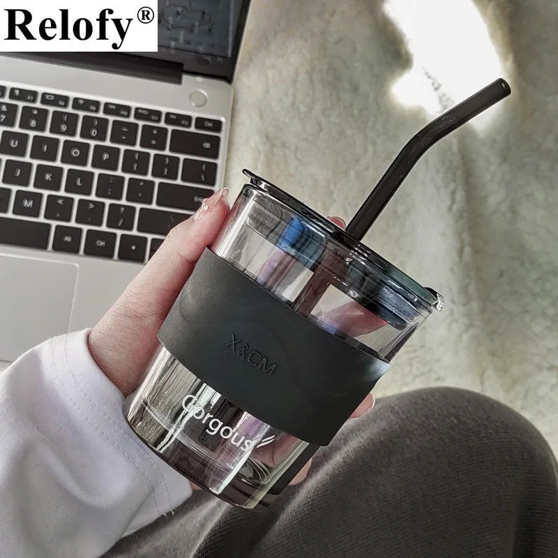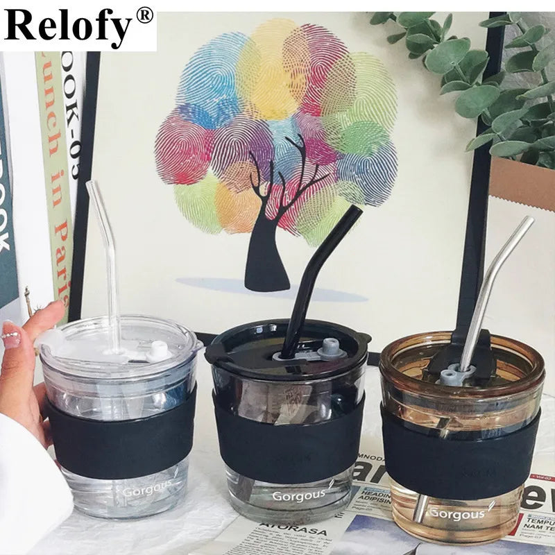 450ml Lead Free Glass Mug with Cup Sleeve and Lid Straw Coffee Cup Juice Glass Cute Coffee Mugs Milk Cups Tea Cup Drinkware