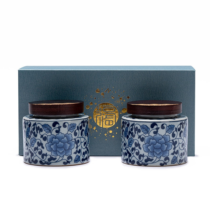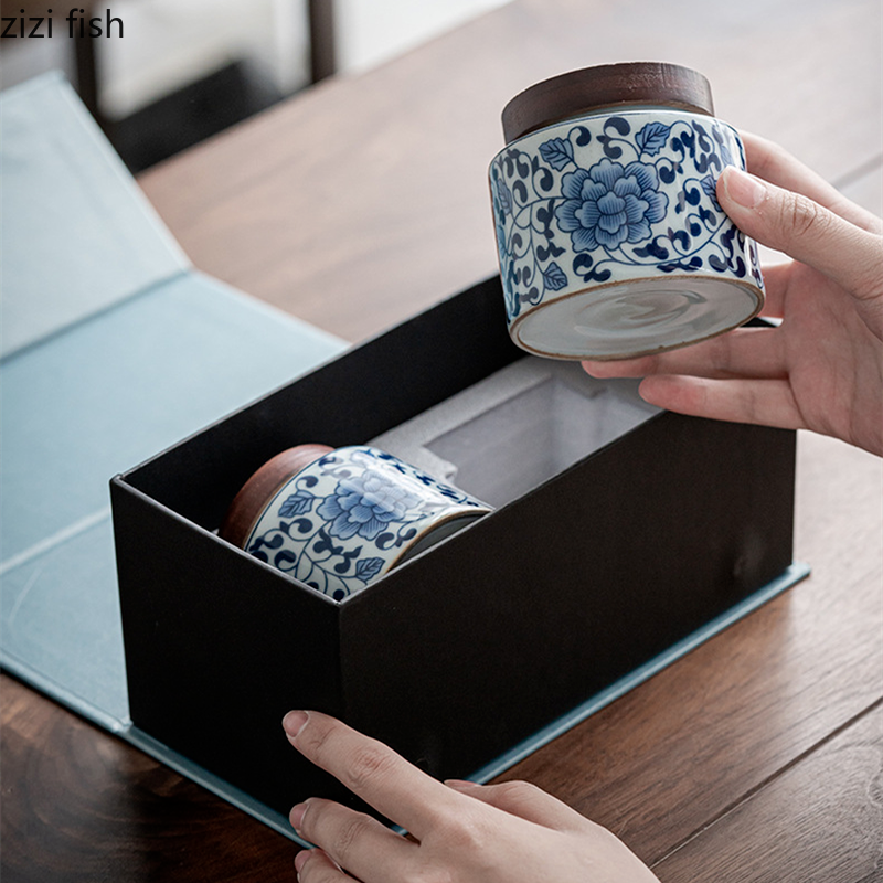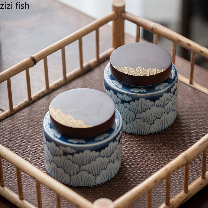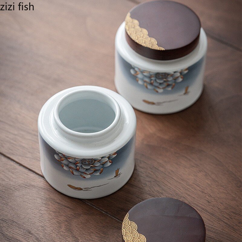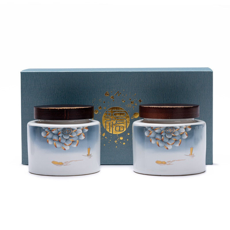 Ceramic Tea Caddy 2 Piece Set Gift Box Wooden Cover Storage Tank Sealed Jar Storage Tank Tea Box Tea Container Candy Jar Tea Can