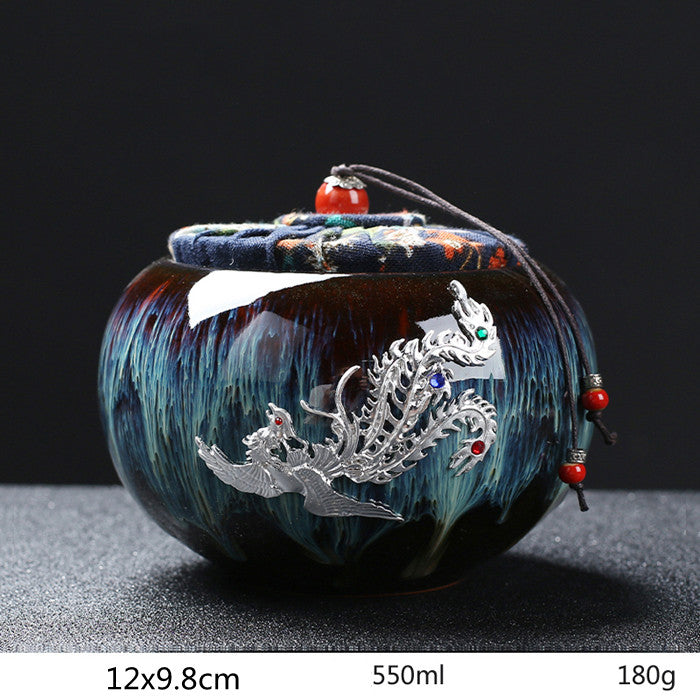 Tianmu Glaze Kiln Change [Inlaid Silver. Phoenix] Single Can + Cloth Box