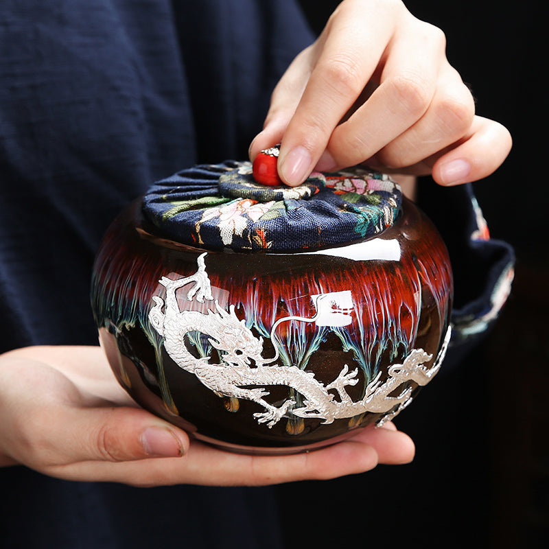 Tianmu Glaze Kiln Change [Inlaid Silver. Dragon] Single Can + Cloth Box