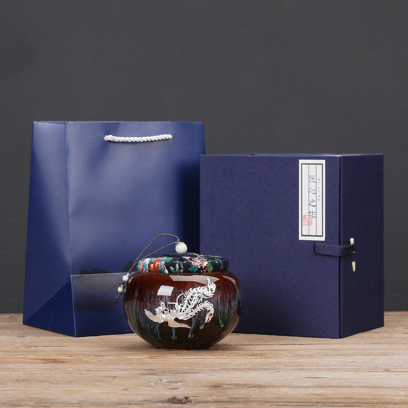 Tianmu Glaze Kiln Change. Inlaid Silver [Dragon + Phoenix] Double Cans Gift Box