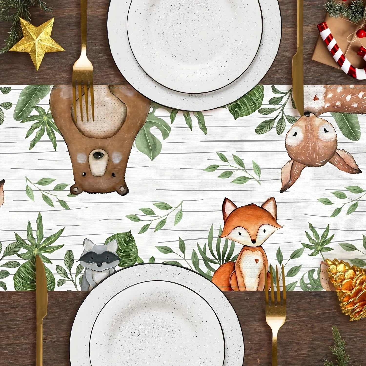 Woodland Animals Linen Table Runner Birthday Party Decor Forest Bear Fox Deer Green Leaves Table Runners Dining Table Home Decor